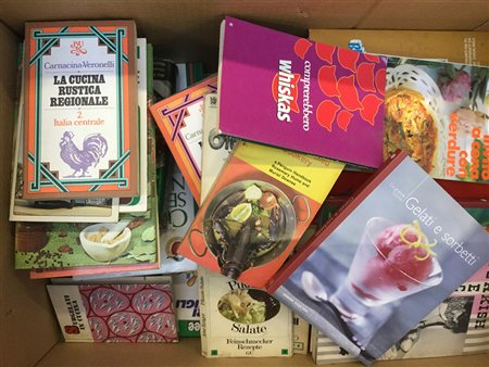 Lotto composto da numerosi libri e riviste di cucina e altri volumi di vario argomento (difetti). In quattro cartoni.