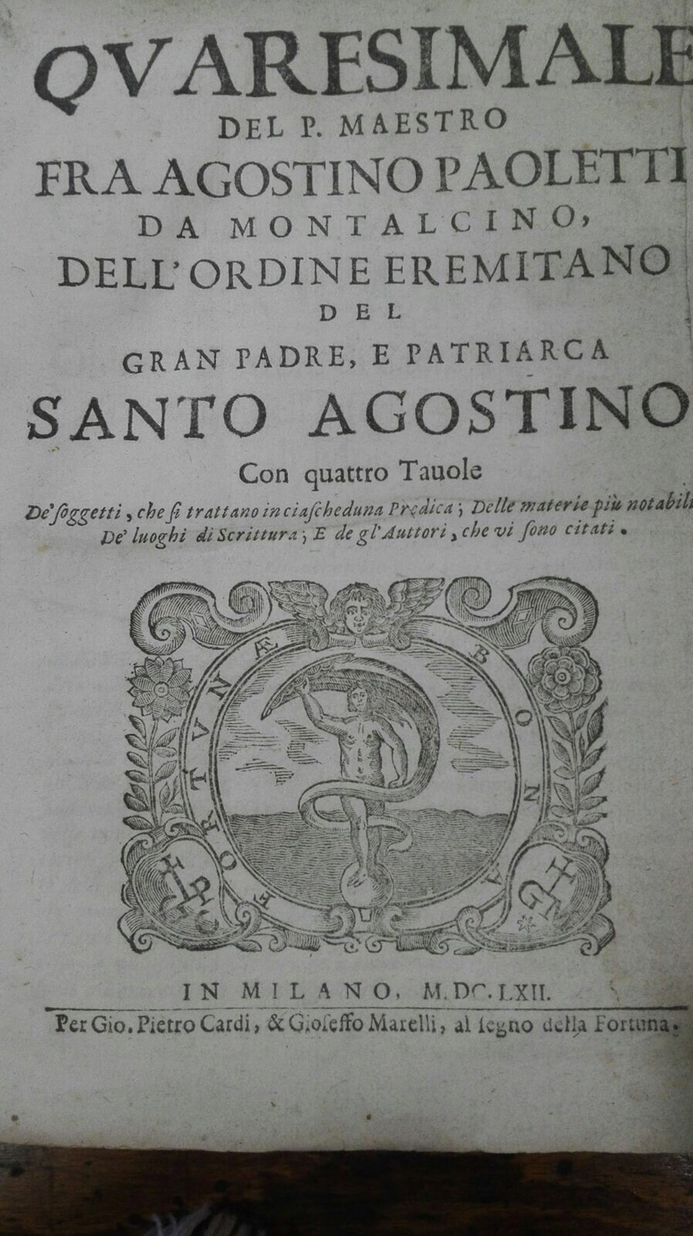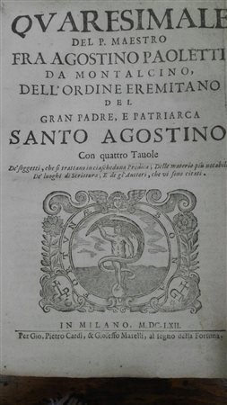 PAOLETTI, Agostino. Quaresimale del P. Mestro Fra Agostino Paoletti da Montalcino. Milano: Cardi Giovanni Pietro & Marelli Giuseppe, 1662. Vol. in 4to, con marca tipografica al frontespizio (difetti). Legatura coeva in piena pergamena con titolo manoscritto al dorso (lievi difetti).