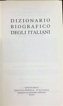 Dizionario Biografico degli Italiani. Roma: Società Grafica Romana, 1960 - ; e Catanzaro: Abramo Printing, 2008. 70 (di 89) volumi in 8vo, con le biografie di vicerè, governatori, prelati, artisti, uomini di pensiero e di scienza. Legatura editoriale in tela blu con decori in oro al dorso (lievi difetti solo in alcuni volumi). In cinque cartoni.