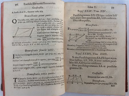 EUCLIDE. Sex priora Euclidis elementa. A Hiemyniano Rondello. Bologna: Longhi, 1719. Volume in 4to con iniziali xilografiche e incisione in antiporta raffigurante l'allegoria della libertà. L'opera presenta numerosissimi disegni geometrici con tavole e formule (bruniture e fioriture). Legatura coeva in mezza pelle.