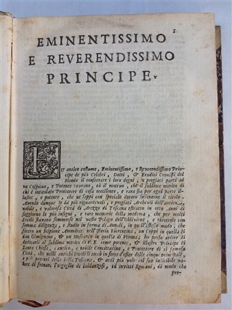 FARULLI, Pietro. Annali, ovvero notizie istoriche dell'antica, nobile, e valorosa città di Arezzo in Toscana. Dal suo principio fino al presente Anno 1717. Foligno: Nicolò Campitelli, [1717]. Volume in 4to con iniziali xilografiche e marchio tipografico dell'editore alla fine (fioriture e bruniture). Legatura in mezza pergamena ottocentesca.