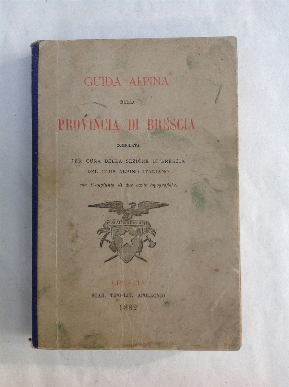 Guida alpina della provincia di Brescia. Brescia: Apollonio, 1882. Volume in 8vo realizzato a cura della sezione di Brescia del Club Alpino Italiano (leggere fioriture). Legatura in copertina originale in mezza tela (macchie).