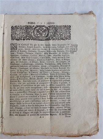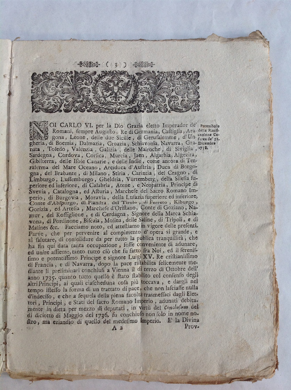 Trattato di pace fra l'imperatore, e l'imperio, ed il re cristianissimo. Conchiuso a Vienna li 18. Novembre 1738. Vienna: 1739. Volume in 4to con marchio tipografico al frontespizio e iniziali xilografiche. Piccoli fregi nella parte superiore di ogni pagina (fioriture e gore di umidità). Legatura inesistente.