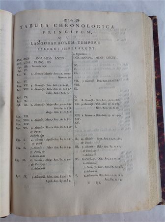 DI BLASIO, Salvatore Maria. Series principum qui longobardorum aetate Salerni imperarunt. Napoli: Raymundiana, 1785. Volume in 4tocon marchio tipografico al frontespizio e iniziali xilografiche. Nello stesso volume sono presenti più opere (fioriture e bruniture). Legatura in mezza pelle con fregi in oro al dorso (leggermente graffiata).