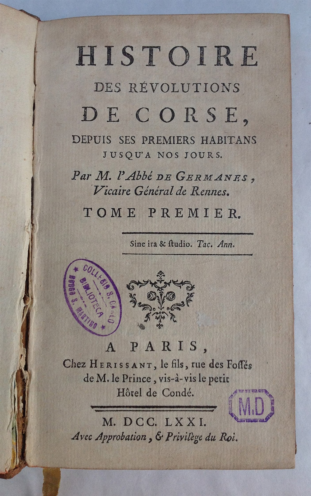 DE GERMANES. Historie des revolutions de Corse. Parigi: Herissant, 1771. 2 volumi in 8vo con marchio tipografico al frontespizio (leggere fioriture e bruniture). Legatura in pelle con fregi in oro al dorso e taglio di colore rosso (il dorso del I volume è leggermente rovinato).