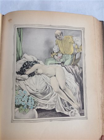 BOCCACCIO; Giovanni. Les contes de Boccace. Decameron. Parigi: Gibert Jeune, 1934. 2 volumi in 4to con marchio tipografico dell'editore al frontespizio e tavola a colori nell'antiporta. Figure in bianco e nero e numerose tavole a colori di Brunelleschi (sporadiche fioriture). Legtura in marocchino verde con decorazioni in oro ai piatti e al dorso.