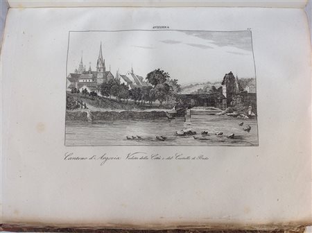 GOLBERY, Filippo. Storia e descrizione della Svizzera e del Tirolo. Venezia: Giuseppe Antonelli, 1840. Volume in 4to con marchio tipografico dell'editore al frontespizio. Testo su due colonne. Numerosissime incisioni raffiguranti i paesaggi, monumenti tipici e personaggi del luogo. Carta geografica ripiegata. Esemplare in barbe (fioriture). Legatura in mezza pelle.