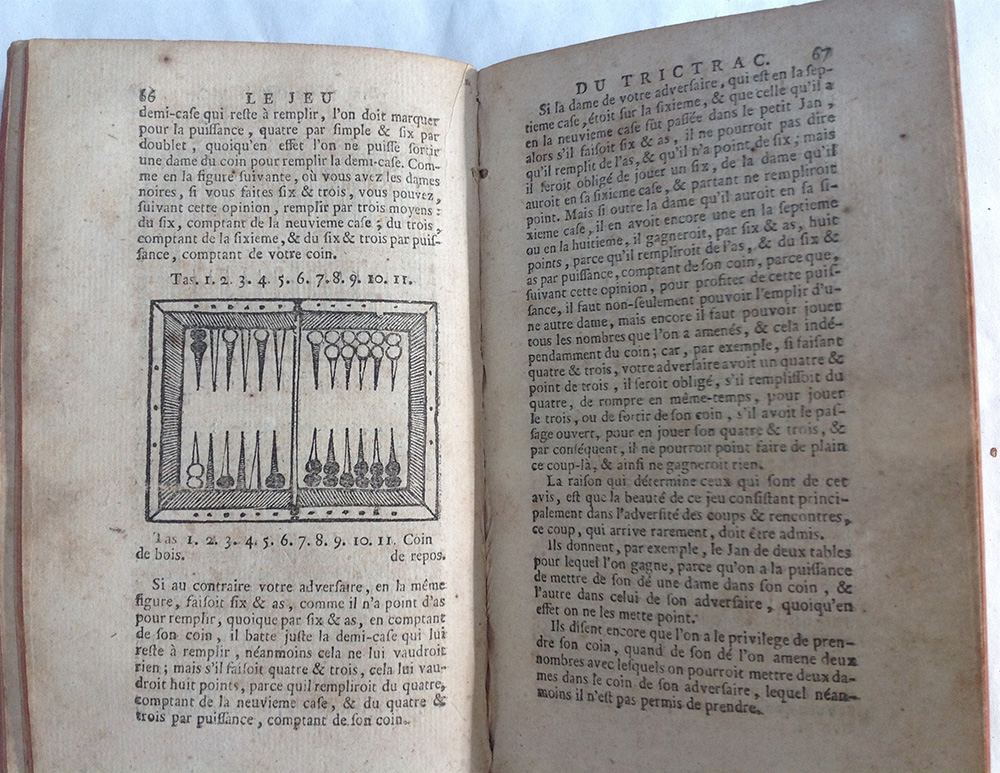 Academie universalle des jeux. Amsterdam: Depens de la compagnie, 1777. 2 parti in un volume in 8vo contenenti le regole di tutti i giochi con le istruzioni facili da imparare così da giocare bene. Marchio tipografico dell'editore al frontespizio e qualche figura nel testo (fioriture e bruniture). Legatura in piena pelle con decori in oro al dorso (rovinato).