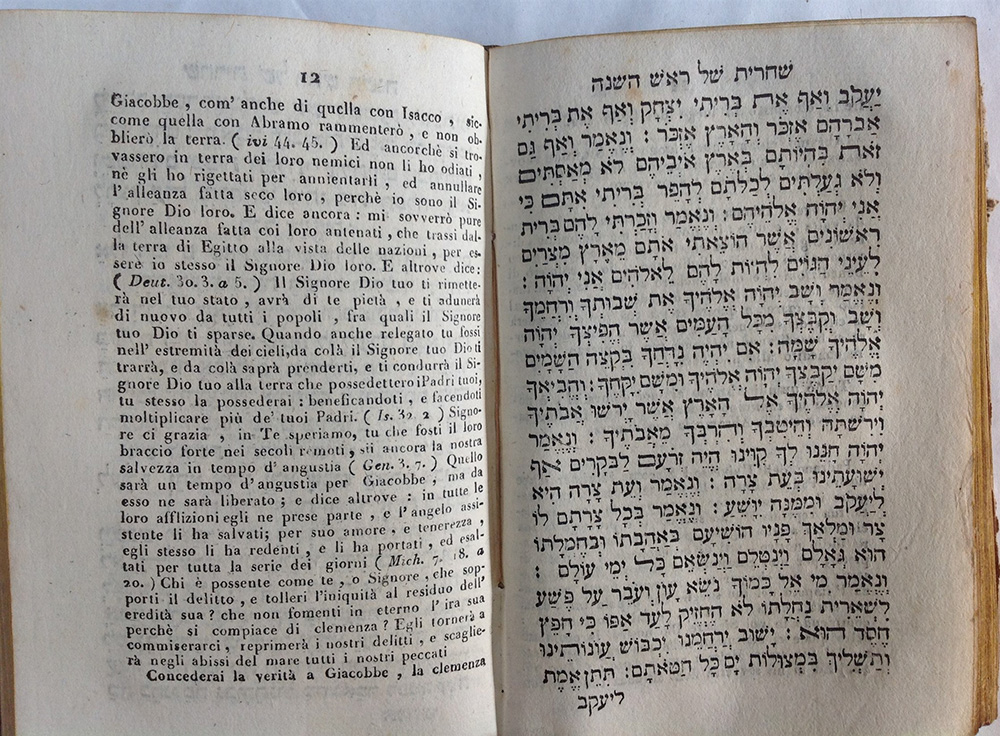 OTTOLENGHI, Lazzaro. Orazioni ebraico-italiano per il capo d'anno, e giorno dell'Espiazione ad uso degli Israeliti Portoghesi, e Spagnoli. Livorno: Sahadun Molco e C., 1820 ca. 2 volumi in uno. In 8vo. Nelle pagine destre vi sono le orazioni in ebraico e in quelle sinistre le traduzioni in italiano (fioriture). Legatura in mezza pelle con decori in oro al dorso (rovinata).