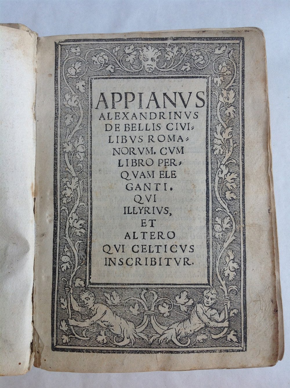 APPIANO, Alessandro. De bellis civilis romanorum. Cum libro per quam eleganti. Qui illyrius, et altero qui celticus inscribitur. Venezia: Bernardino de Vitali, 1526. Volume in 8vo con bordura xilografica al titolo e iniziali xilografiche (fioriture). Legatura in pergamena coeva morbida (macchie).