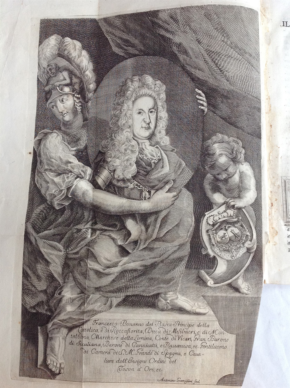 CAMPAILLA, Tommaso. L'Adamo, ovvero il mondo creato. Roma: Antonio Roffi, 1737. Volume in 4to con iniziale della prefazione dell'autore incisa. Iniziali xilografiche e grande tavola ripiegata raffigurante il ritratto di Francesco Bonanno, principe della cattolica e di Roccafiorita, cui l'opera è dedicata (fioriture). Legatura in pergamena morbida (piatto anteriore e dorso scollati dal volume).