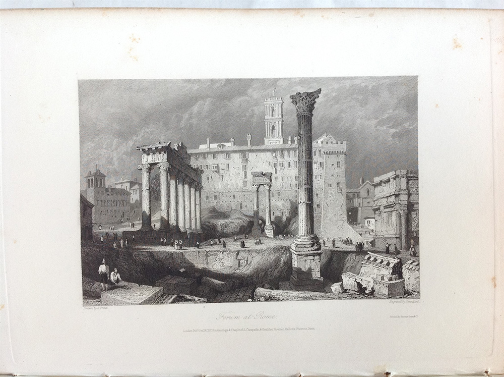 ROSCOE, Tommaso. The landscape annual. Londra: Gennings & Chaplin, 1831-34. 2 volumi in uno in 8vo. 2 titoli e 103 tavole incise, raffiguranti paesaggi, monumenti e abitanti dell'Italia e alcuni della Svizzera (fioriture). Legatura in pergamena.