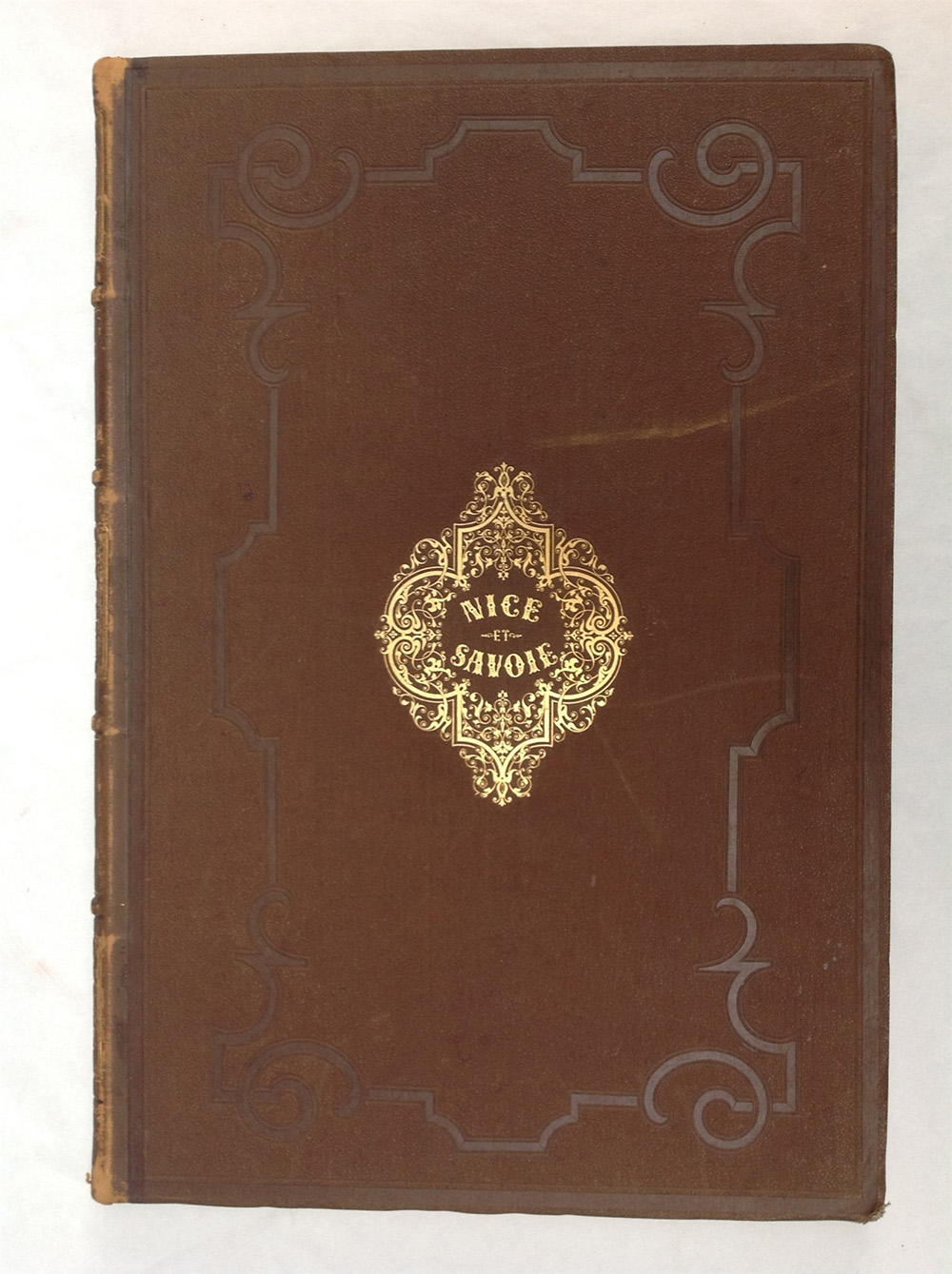 BENOIST, Felice. Nice et savoie, sites pittoresques. Parigi: Enrico Charpentier, 1864. Volume in-folio con grande marchio tipografico dell'editore al frontespizio e lettere xilografiche. Numerose tavole a colori, specialmente nella terza parte che riguarda le Alpi Marittime (fioriture). Legatura editoriale in piena tela con fregi in oro ai piatti e al dorso, taglio color oro.