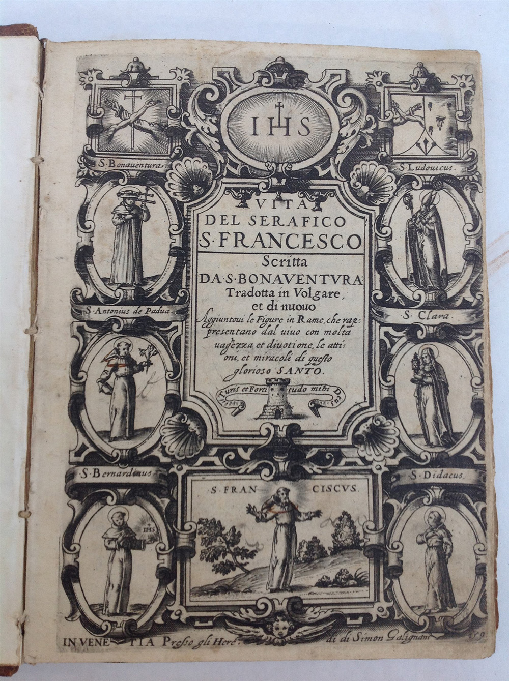 SAN BONAVENTURA. Vita del serafico S. Francesco. Venezia: Galigniani, 1593. Volume in 4to con frontespizio decorato dalle immaginette di vari santi: Santa Clara, San Bernardino, Sant'Antonio da Padova e altri. Iniziali xilografiche e diverse tavole che raffigurano le varie fasi della vta del Santo Francesco incise da Giacomo Franco (fioriture). Legatura settecentesca in mezza pelle decorata al dorso.