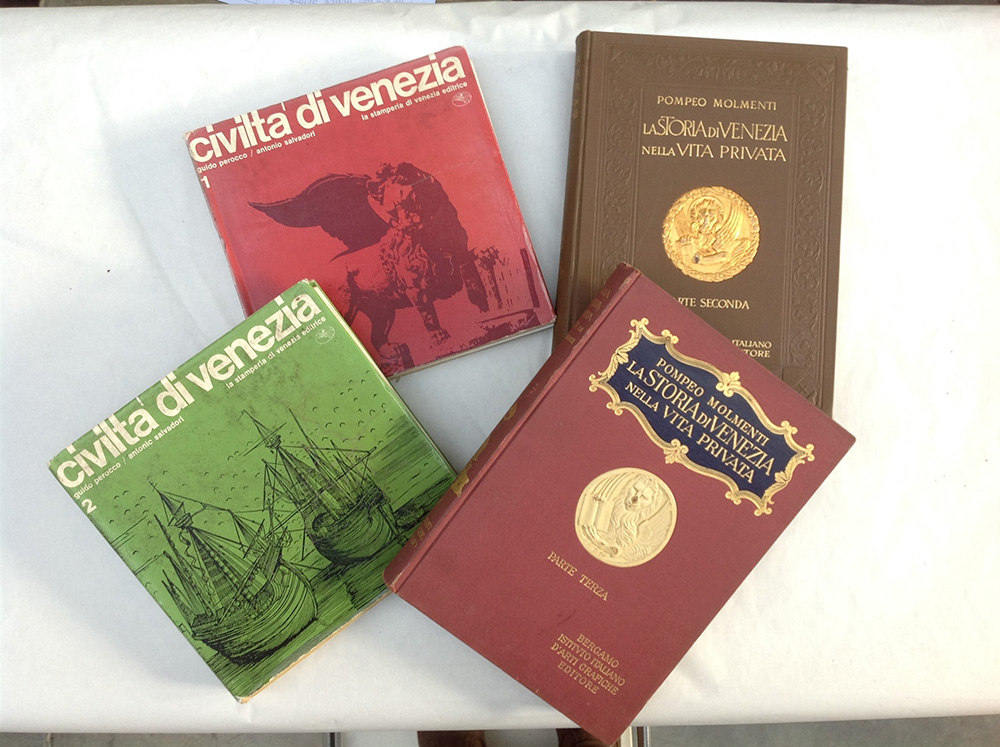 Lotto composto da: - MOLMENTI, Pompeo. La storia di Venezia nella vita privata. Bergamo: Isttuto Italiano di arti grafiche, 1926. 2 volumi in 8vo grande contenente molte illustrazioni e tavole ripiegate (fioriture). Legatura editoriale con leone di San Marco in medaglione a sbalzo. Decori ai piatti e al dorso in oro. - SALVADORI, Antonio e PEROCCO, Guido. Civiltà di Venezia. Venezia: la stamperia di Venezia, 1950 ca. 2 volumi in 4to con numerose immagini e piante di monumenti e chiese. Legatura editoriale e sovracoperta.