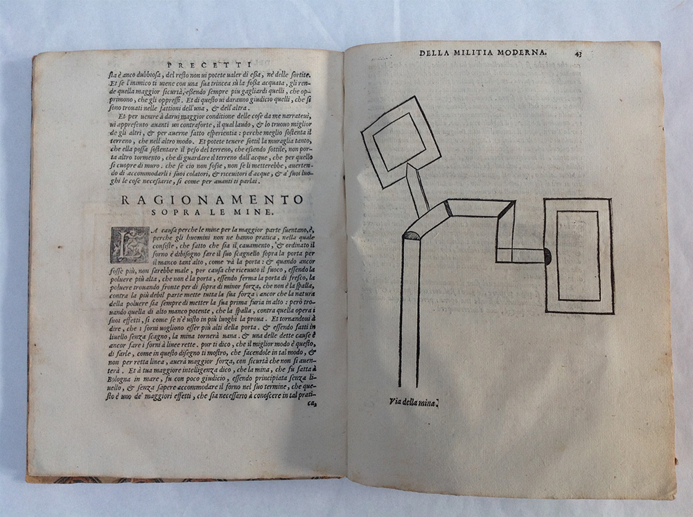 RUSCELLI, Girolamo. Precetti della milizia moderna. Venezia: Sessa, 1568. Volume in 4to con marchio tipografico dell'editore al frontespizio e iniziali xilografiche. Molte figure all'interno del testo incise in legno. Ex libris “Principe Borghese” (fioriture e gore di umidità). Legatura cartonata.