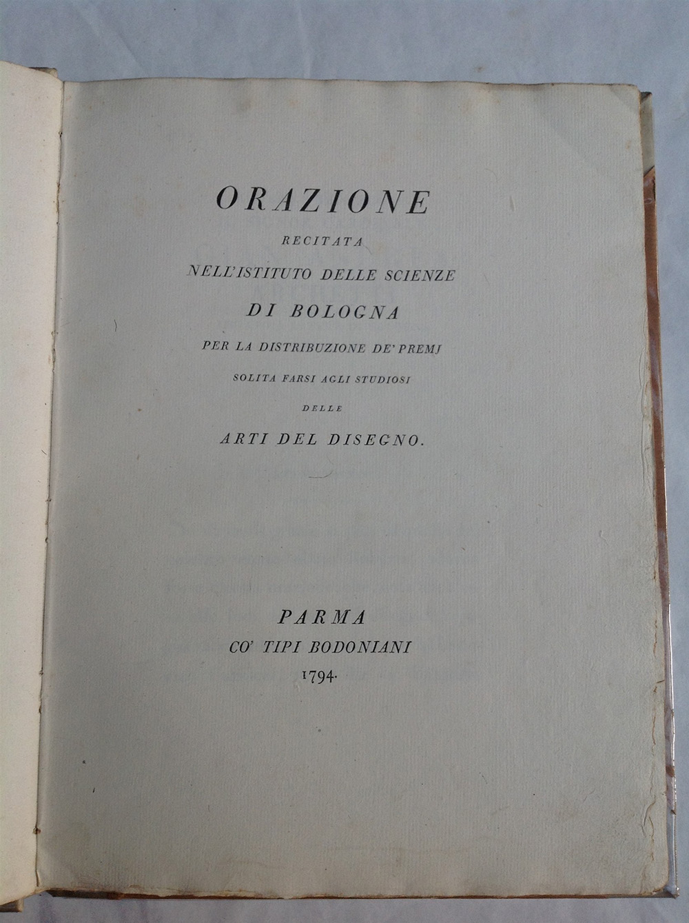 Orazione recitata nell'istituto delle scienze di Bologna per la distribuzione de' premi. Parma: Bodoni, 1794. Volume in 4to. Legatura in mezza pergamena.
