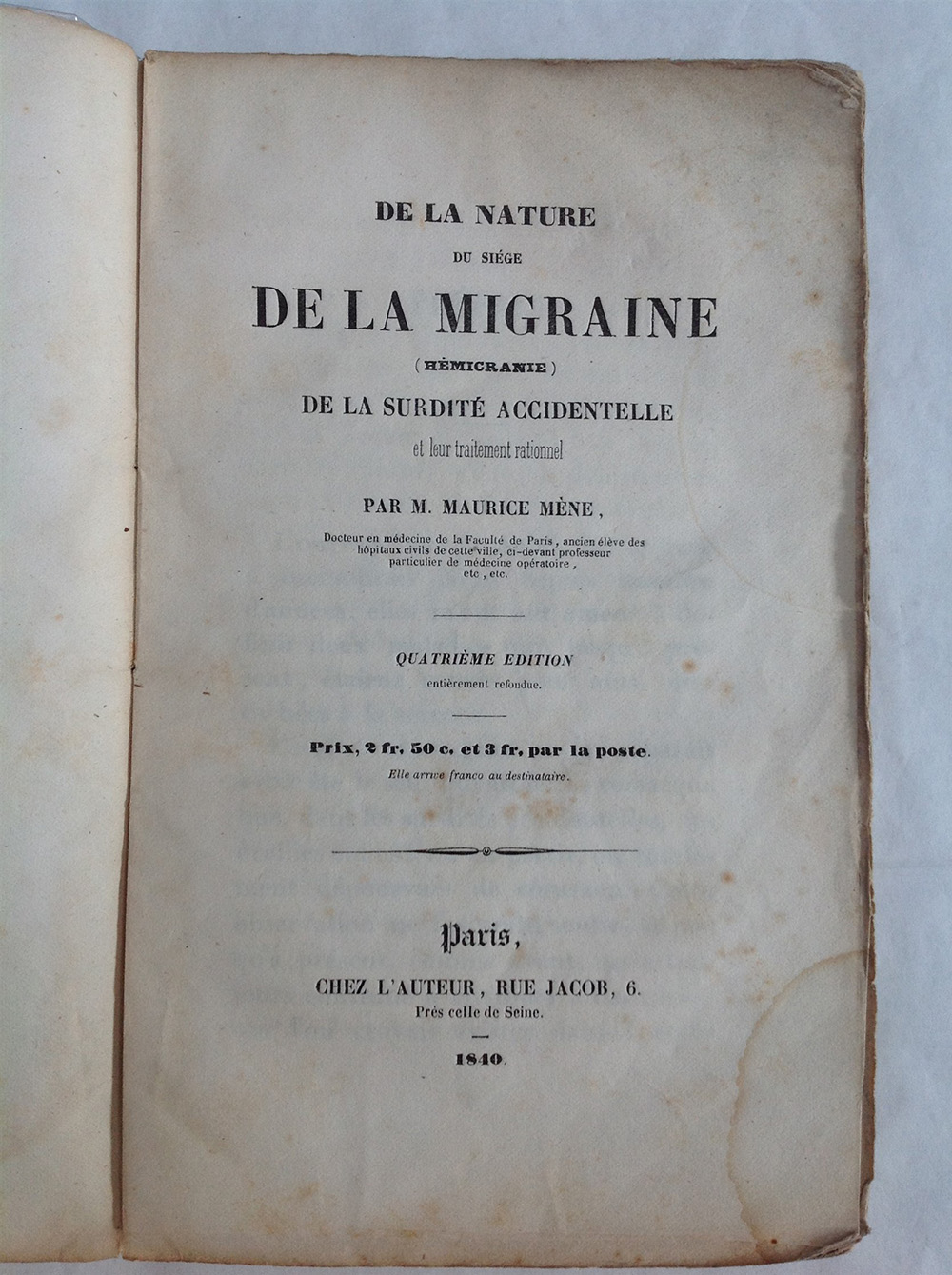 MENE, Maurizio. De la nature du siege de la migraine. Parigi: 1840. Volume in 8vo (fioriture gore di umidità e parte finale del volume staccata in parte dal dorso). Copertina originale sciupata.