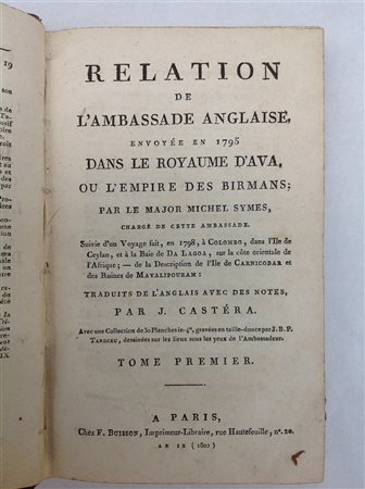 SYMES, Michele. Relation de l'ambassade anglaise envoyee en 1795 dans le royaume d'Ava, ou l'Empire des Birman. Parigi: Buisson, 1800. 3 volumi in 8vo (fioriture). Legatura dell'epoca in piena pelle con decorazioni in oro al dorso (difetti).
