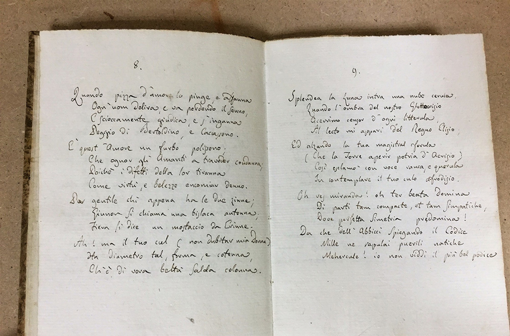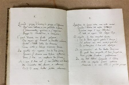 TESTA, Francesco. La Culeide. Sonetti 100. Sec. XVIII. Manoscritto cartaceo (cc. I, 1-2 (16), 3 (18), I'; 169 x 120mm). Scrittura settecentesca (fioriture e leggere gore di umidità). Legatura ceova in cartone, con al dorso etichetta in pelle rossa con indicazione di autore e titolo.