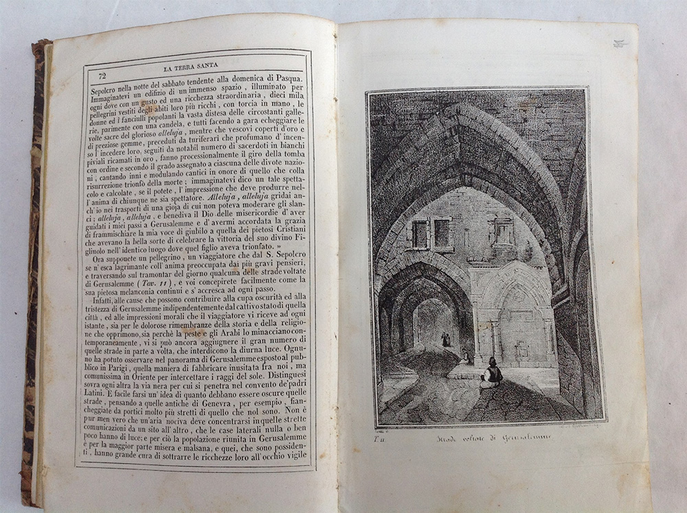 La Terra Santa ed i luoghi illustrati dagli apostoli. Napoli: Guttember, 1840. Volume in 8vo con 48 tavole in bianco e nero e a colori. Legatura in mezza pelle con decori in oro al dorso.