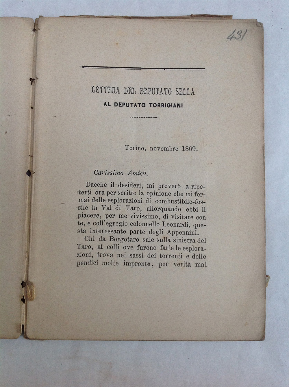 SELLA, Quintino. Sul combustibile italiano. Torino: Tipografia Letteraria, 1869. Volume in 8vo senza legatura.