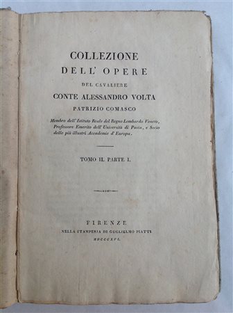 VOLTA, Alessandro. Collezione delle opere. Firenze: Guglielmo Piatti, 1816. 4 volumi in 8vo (fioriture e bruniture). Legatura editoriale in cartoncino con tassello (difetti).