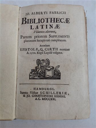 FABRICIO, Alberto. Bibliotecae latinae. Amburgo: Schilleriae, 1721. Volume in 8vo (fioriture e bruniture). Legatura in mezza pergamena.
