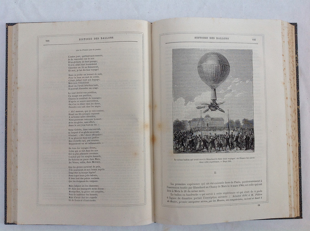 CIRCOS, A. - PALLIER, TH. Historie des ballons et des ascension celebres. Parigi: Roy, 1876. Volume in 8vo grande con marchio tipografico dell'editore al frontespizio e il ritratto di Nadar all'antiporta. Numerose illustrazioni da disegni di Tissandier (fioriture). Legatura in piena pelle (difetti).