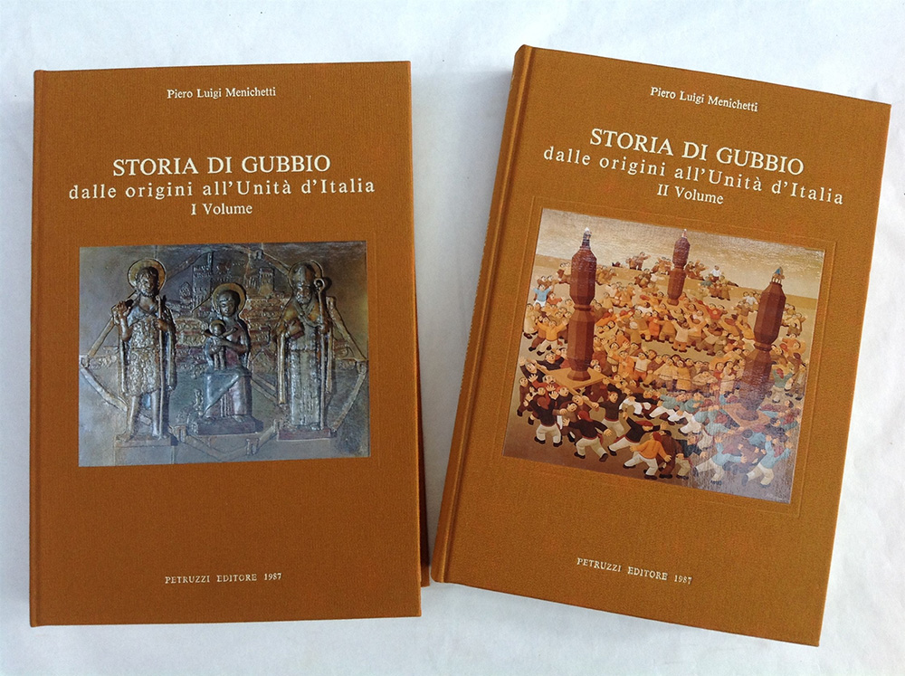 MANICHETTI, Piero Luigi. Storia di Gubbio dalle origini all'Unità d'Italia. S.l.: Petruzzi Editore, 1987. 2 volumi in 4to con numerose illustrazioni in bianco e nero e a colori. Legatura in tela con cofanetto.
