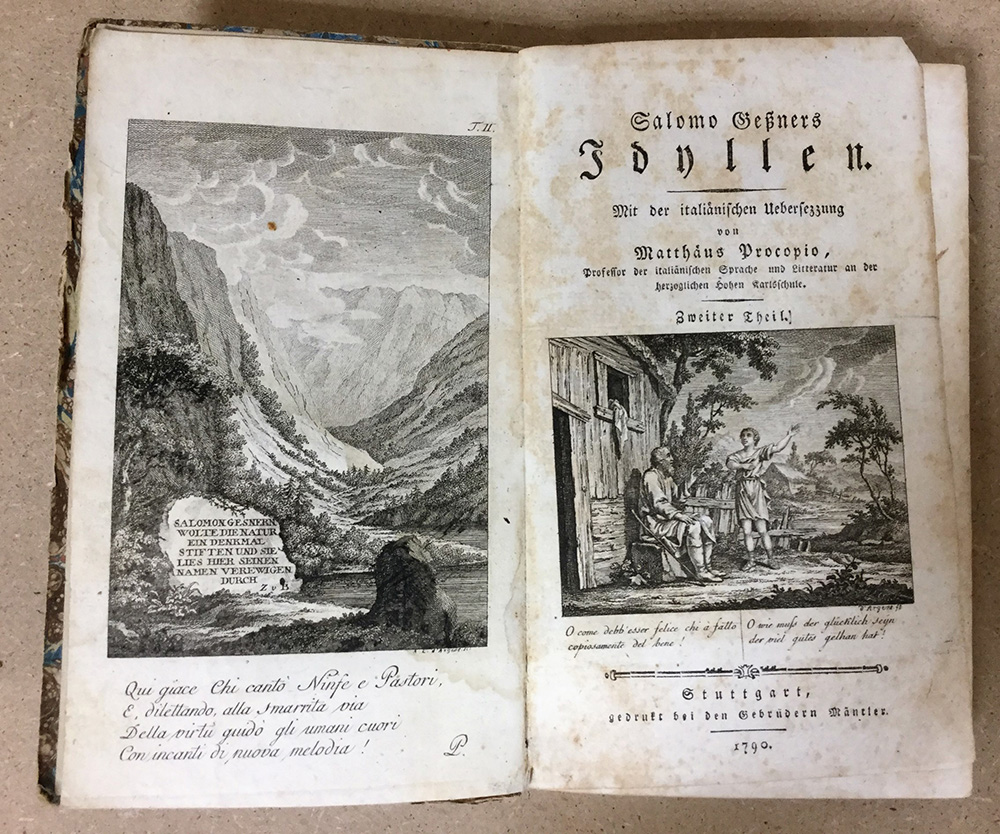 GESSNER, Salomon. Idyllen. Stoccarda: Gebrudern Mantler, 1790. 2 volumi in 8vo con incisione nell'antiporta al 2° volume (manca il frontespizio al 1° volume; lievi fioriture e bruniture). Legatura cartonata (difetti).