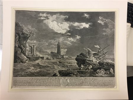 VERNET, Charles. Naufragio. Incisione (420x562 mm rifilata) in bianco e nero (buchi). In passe partout.