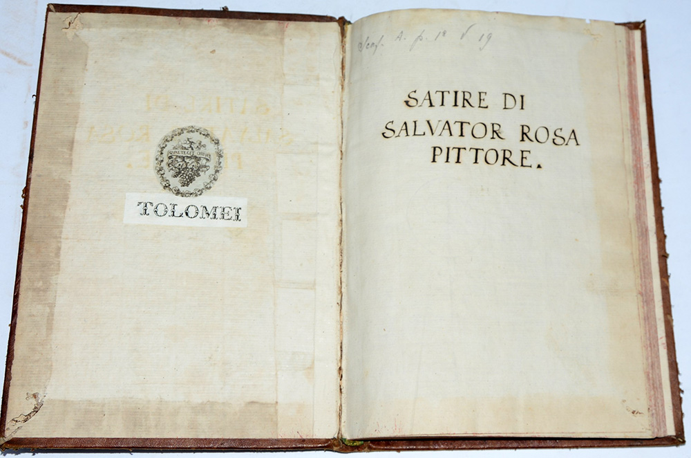 ROSA, Salvator (Napoli 1615-Roma 1673). Satire e sonetto "A chi non lo credeva Autore delle Satire...". Manoscritto del XVIII secolo. Salvator Rosa, noto per la sua produzione pittorica, è anche autore di sette satire e alcune odi per musica. Considerato poète maudit, nelle Satire Rosa prende ripetutamente posizione all'interno della questione tra antichi e moderni, propendendo per gli antichi e assumendo una posizione fortemente critica nei confronti dell'età in cui vive. Le prime sei Satire furono pubblicate postume nel 1695 (la settima fu data alle stampe solo nel 1876) e messe all'Indice il 24 dicembre 1700 a causa delle invettive contro la corruzione della Chiesa presenti nella V Satira dal titolo "La Babilonia". Per lungo tempo circolarono in copie manoscritte ed edizioni pirata. In 8vo. Scrittura corsiva calligrafica databile al XVIII secolo, quindi di epoca successiva alla messa all'Indice dell'opera; di mano diversa (di poco posteriore) il sonetto. Legatura settecentesca coeva in piena pelle, con fregi dorati al dorso e impressioni in oro sui piatti (lievi difetti).
