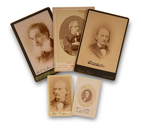 [RITRATTI] -- Raccolta di cinque ritratti fotografici di personaggi noti del XIX e del XX secolo. Cinque ritratti di interesse storico notevole: tre sono di Cesare Cantù (1804-1895), scrittore, storico e giornalista. Un ritratto è di Emanuele Notarbartolo di San Giovanni (1834-1893), banchiere e politico italiano, passato alla storia per essere stato la prima vittima eccellente della Mafia in Sicilia. Il quinto è di Aleardo Aleardi (1812-1878), poeta romantico e politico italiano. Alcuni con firma autografa. Lievi fioriture. -EN [RITRATTI] -- Raccolta di cinque ritratti fotografici di personaggi noti del XIX e del XX secolo. Cinque ritratti di interesse storico notevole: tre sono di Cesare Cantù (1804-1895), scrittore, storico e giornalista. Un ritratto è di Emanuele Notarbartolo di San Giovanni (1834-1893), banchiere e politico italiano, passato alla storia per essere stato la prima vittima eccellente della Mafia in Sicilia. Il quinto è di Aleardo Aleardi (1812-1878), poeta romantico e politico italiano. Alcuni con firma autografa. Lievi fioriture. A group of five portraits of renown characters from the 19th and 20th-century. Three are of Cesare Cantù, writer, historian and journalist; one is of Emanuele Notarbartolo di San Giovanni, banker and politician, rememberd as the first Mafia victim in Sicily; the final one is of Aleardo Aleardi, romantic poet and politician. Some are signed (light spotting).
