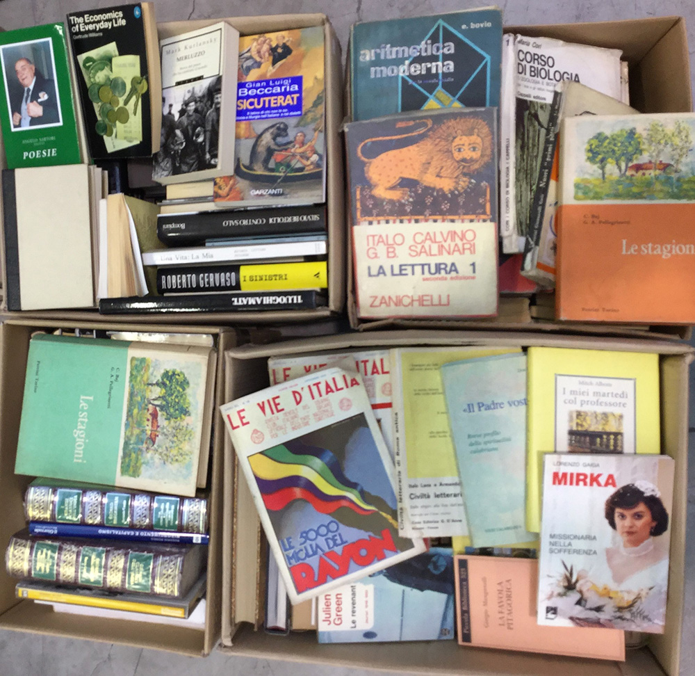 Lotto composto da numerosi romanzi, volumi di argomento vario e manuali scolastici (lievi difetti). In cinque cartoni.