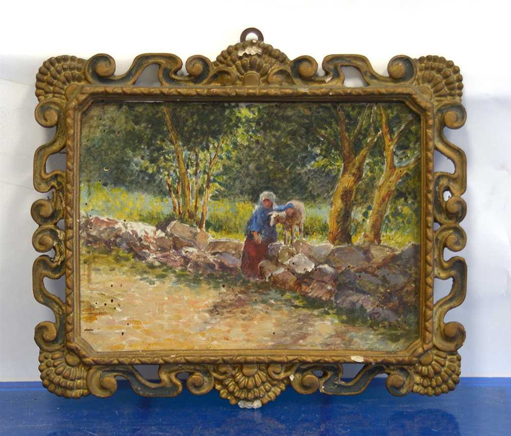 Scuola del secolo XIX "Parsaggio fluviale con contadina e pecora" olio su tavoletta (cm 17x25) reca firma Pizzi in basso a destra, in cornice (difetti)