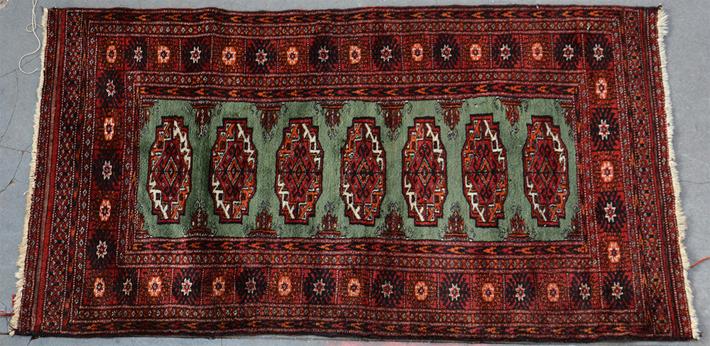 [Tappeti] Tappeto Bohukara, Pakistan, secolo XX. Disegno a Gul rosso su fondo verde (cm 200 x 130) (difetti)