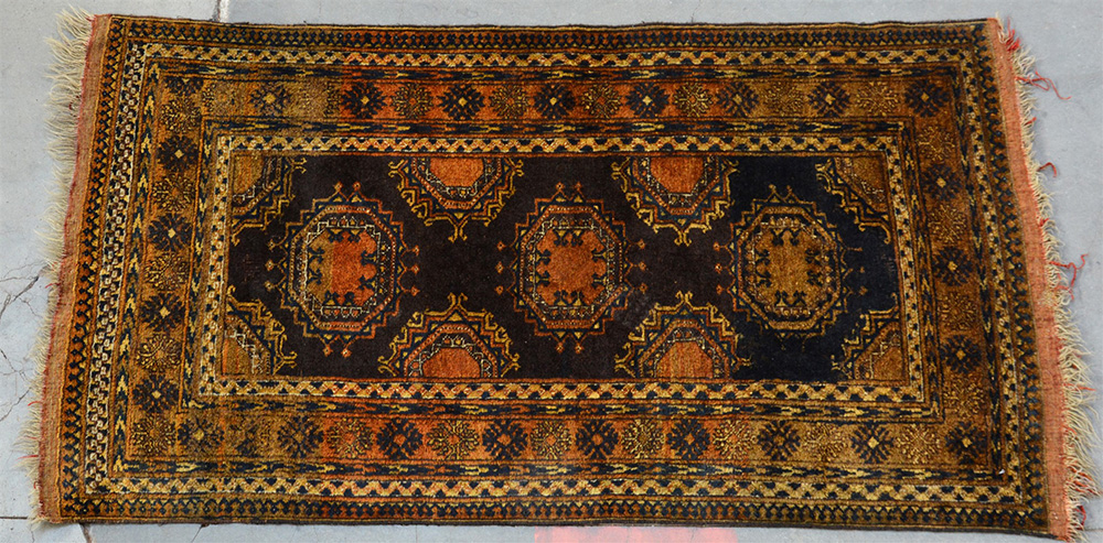[Tappeti] Tappeto Afghan, Turkestan occidentale, inizio secolo XX. Disegno a Gul coronati color doré su fondo marrone scuro. (cm 190x108) (difetti)