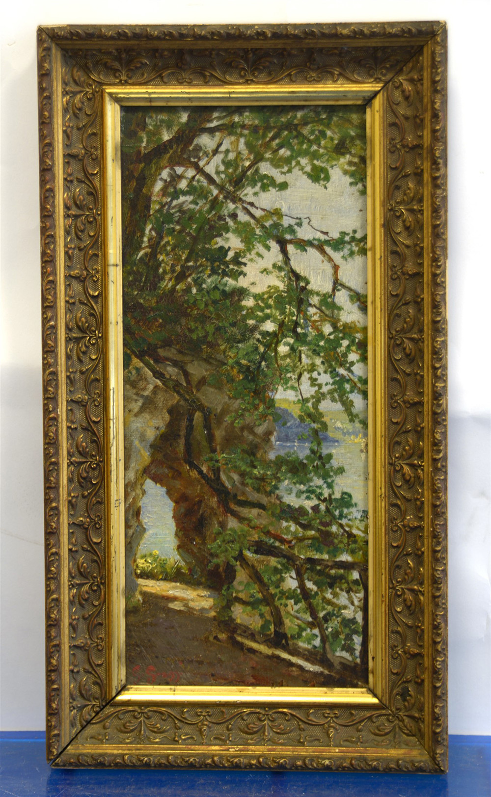 Scuola del secolo XIX "Scorcio di lago con albero in primo piano" olio su tavoletta (cm 36x16) reca firma G. Grossi in basso a sinistra, inncornice (difetti)