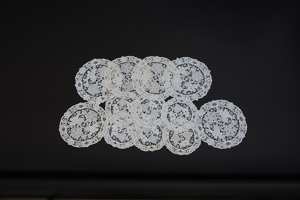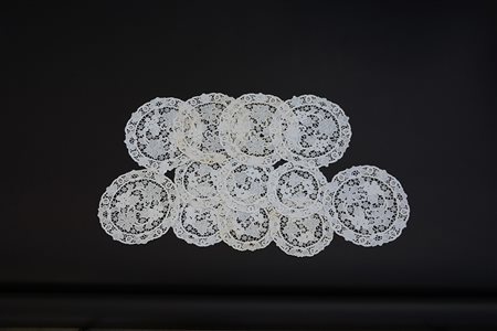 [Tappeti] Lotto composto da sei centrini piccoli e sei piccolissimi in pizzo Venezia (d. 19 cm e 14 cm) (lievi difetti)