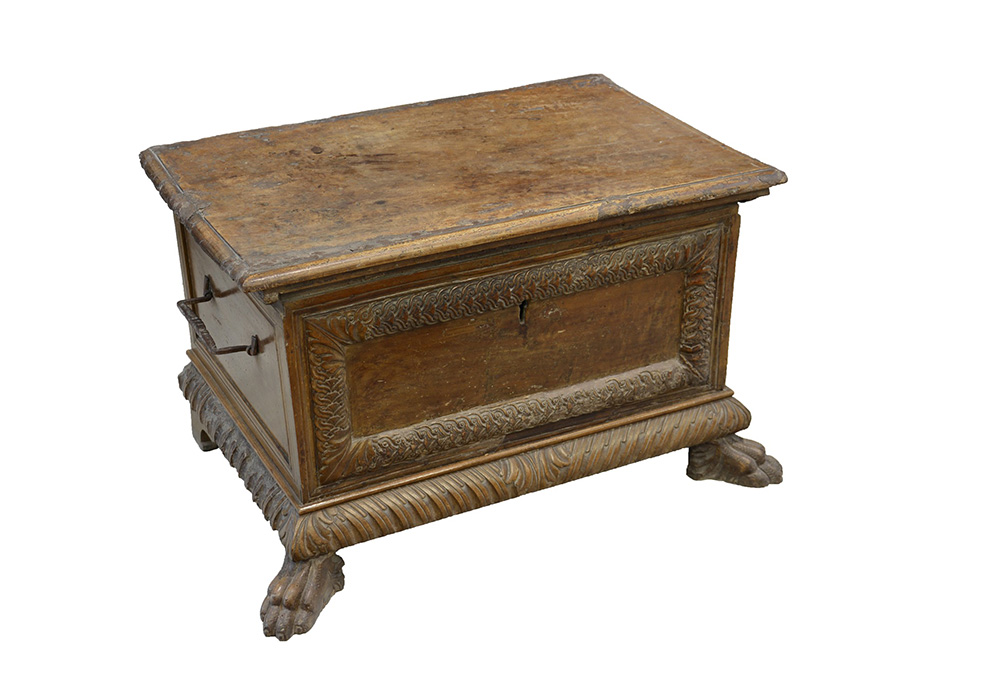 Piccola cassapanca con fronte riquadratao da motivo vegetale ripetuto, fascia intagliata, piedi anteriori a zampa ferina (cm 92x54x60)(mobile costruito con elementi del secolo XVII/XVIII) (difetti)