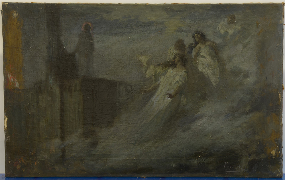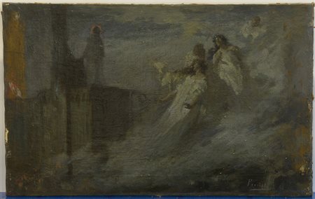 Maestro del secolo XIX "Madonna e angeli" olio su tela (cm 35x55) reca firma Previati in basso a destra, in cornice (difetti) Autenticato al retro dal Prof. Amadore Porcella