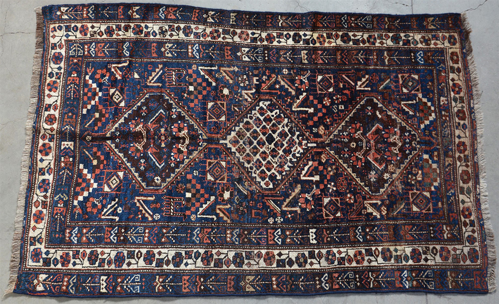 [Tappeti] Tappeto Shiraz, Persia, secolo XX. Disegno a tre medaglioni su fondo blu notte (cm 174x123) (difetti)