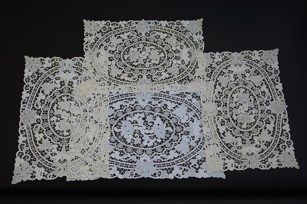 [Tappeti] Lotto composto da sei americane ed un centrotavola rettangolare in pizzo Venezia (cm 46x31; 42x28 cm)