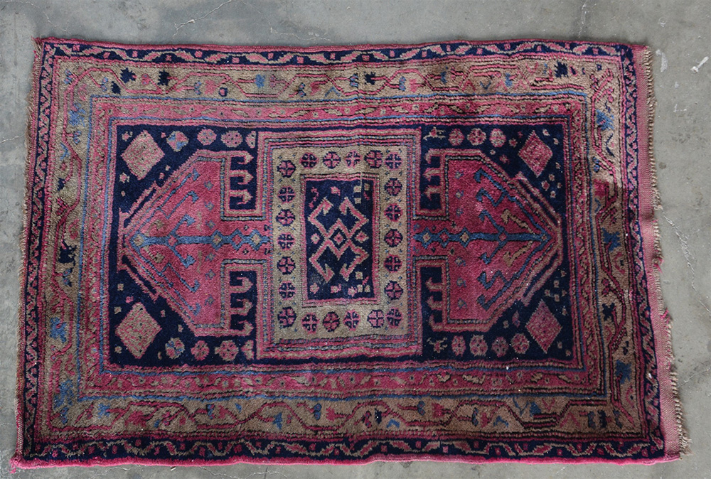 [Tappeti] Tappeto Ushak, Anatolia, secolo XX. Disegno a medaglione rettangolare con due grandi puntali su fondo blu (cm 126x90) (difetti)