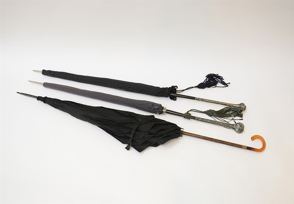 Lotto di tre ombrellini da donna di cui due con manici in argento (lievi difetti)