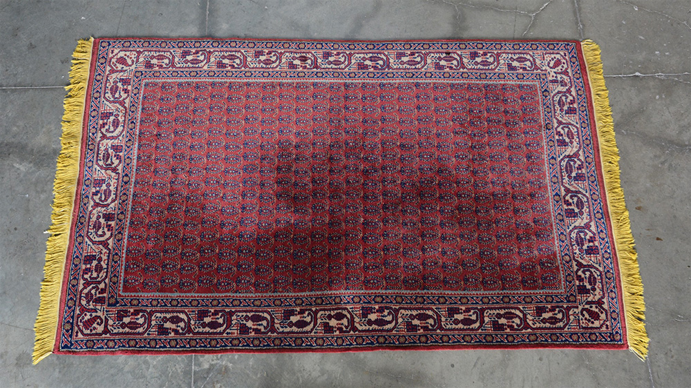 [Tappeti] Tappeto rumeno, secolo XX. Disegno "Mir" nei toni del blu, azzurro e bianco su fondo rosso (cm 230x149) (difetti)
