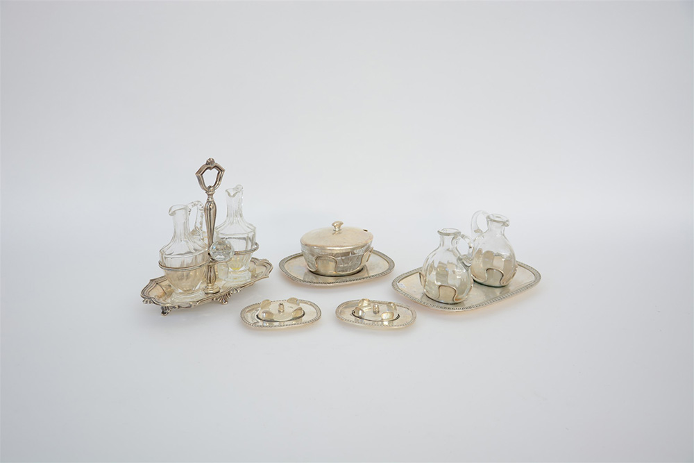 Lotto in argento composto da un'oliera, una formaggera, due salierine con bordura a palmette ed un'oliera con bordura sagomata. Italia, sec. XX ((gr 1110 ca.) (difetti)