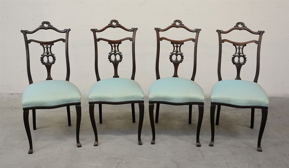 Gruppo di quattro sedie con schienale a giorno e cartella intagliata e traforata. Gambe mosse. Inghilterra fine sec. XIX (difetti)
