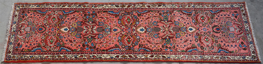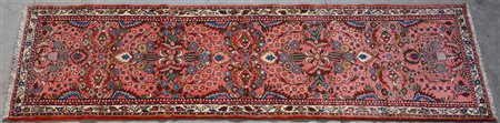 [Tappeti] Tappeto Mossul, Persia, secolo XX. Disegno floreale policromo su fondo rosa (cm 290x82) (difetti)
